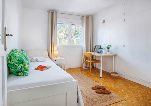 Spacious private bedroom with a shared bathroom (shared for up to 2 people). Access your own private balcony and enjoy a private desk in your room to work comfortably.